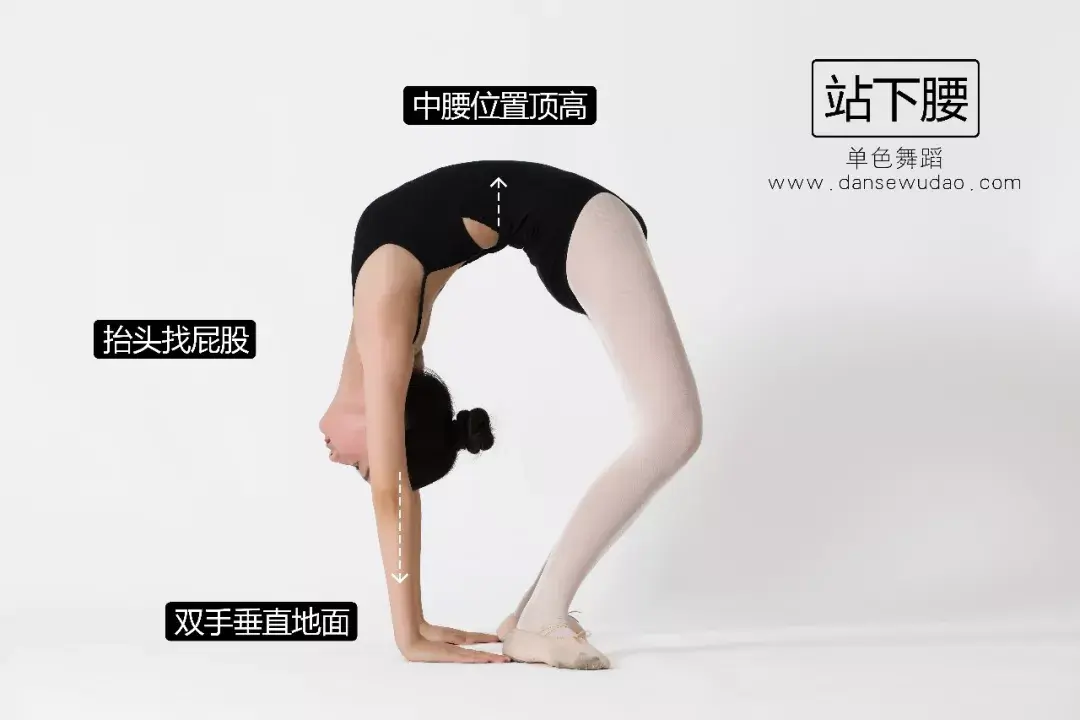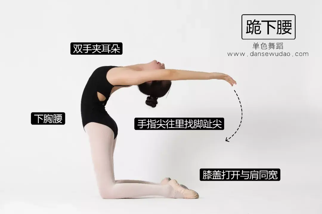 下腰时,上半身向后仰,头抬起来向后找自己的脚后跟,身体和手都向脚后跟靠齐并往里卷。
