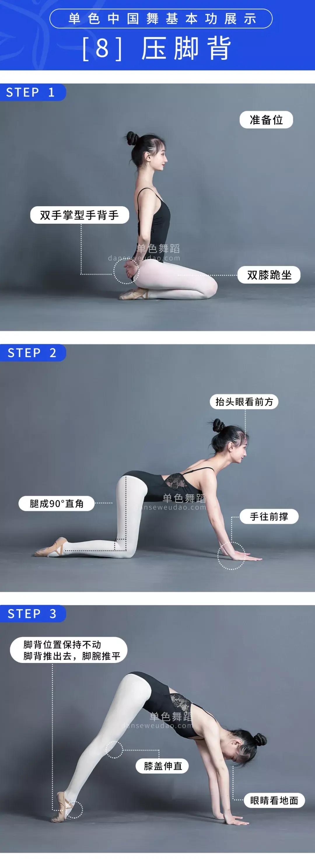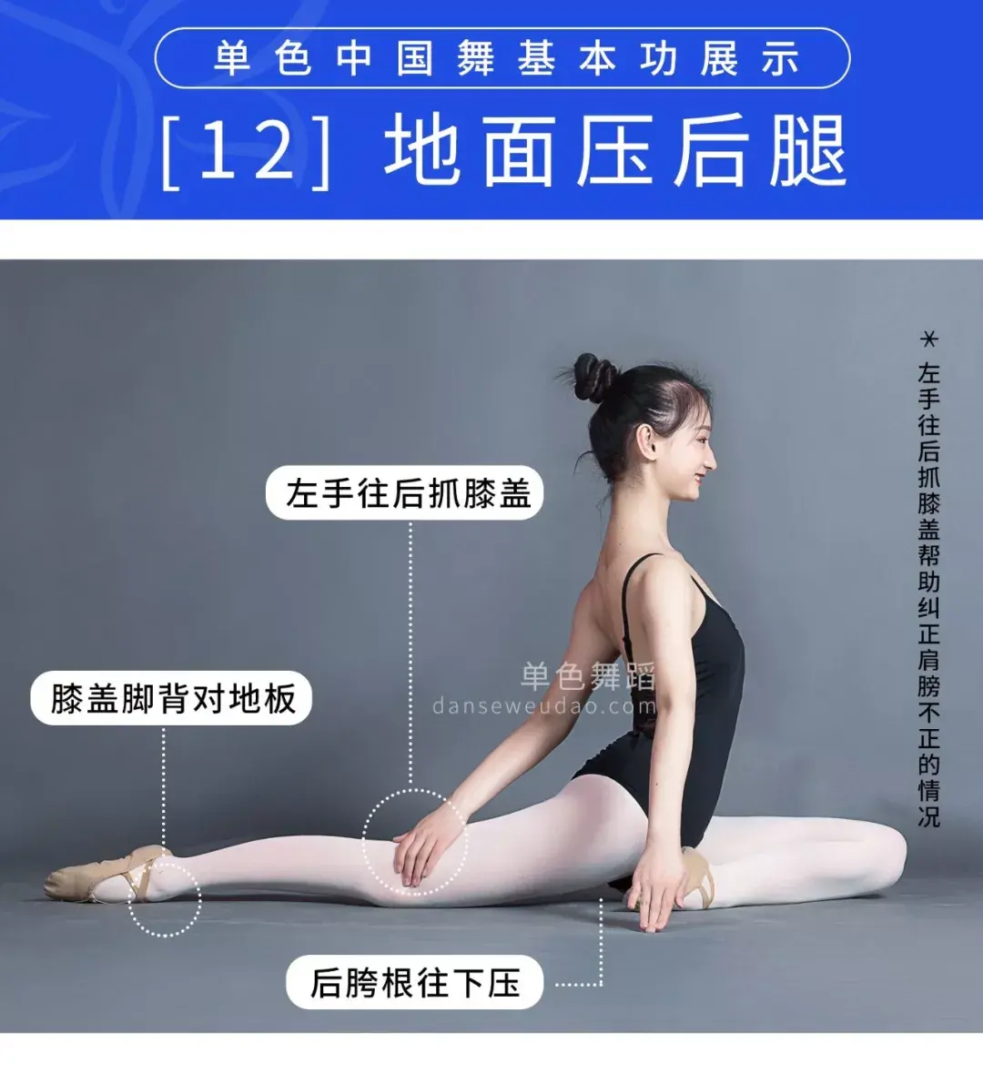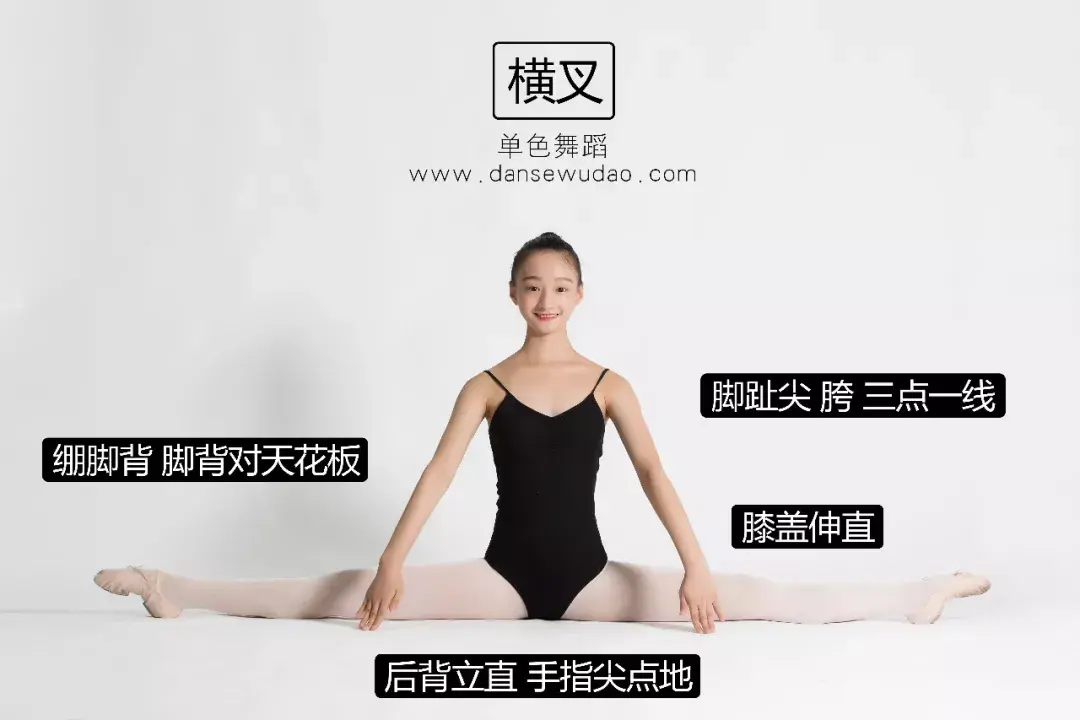 脚背和膝盖都要绷直,切忌身体前倾。