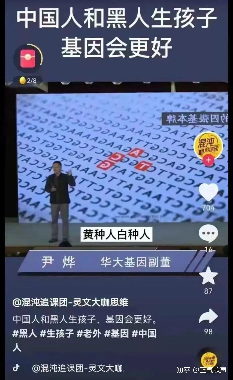 最近笔者看到了这样的一幅图片,一位所谓的专家堂而皇之地在公开场合放言“中国人和黑人生孩子,基因会更好”,鼓励中国人和黑人联姻。